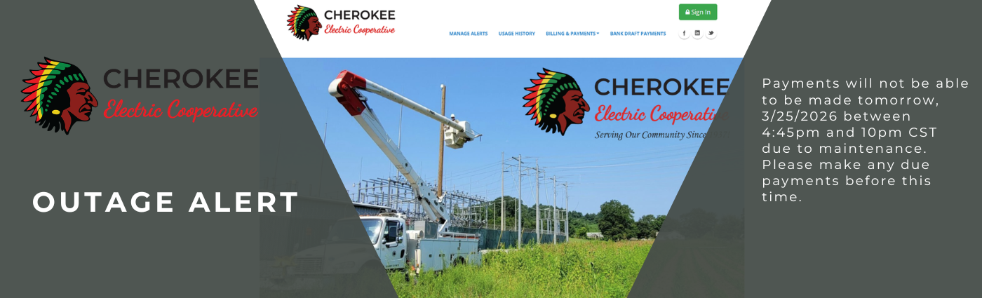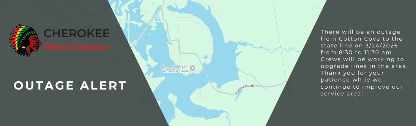 If you are a Cherokee Electric Cooperative member and you experience a power outage, please notify us by telephone so we can make every effort to restore your service as soon as possible. Landline telephones are not normally affected by power outages. Keep in mind that depending on the size of the affected area there could be dozens or even hundreds of members trying to call. Our service department needs to know the full extent of the outage.